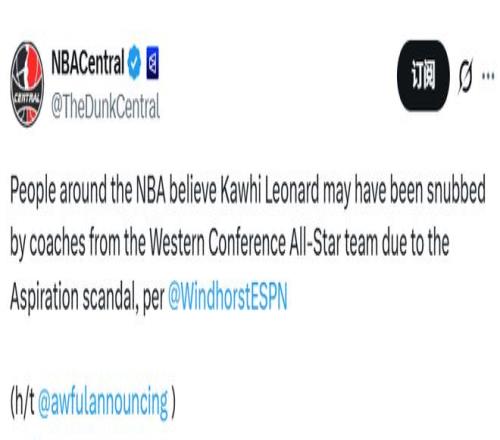 西部全明星的七個(gè)替補(bǔ)名額由教練們投票選出,但他們跳過(guò)了萊昂納德。根據(jù)文霍斯特的爆料,或許是受到了他與快船贊助商存在“虛假代言”爭(zhēng)議的影響。教練組與聯(lián)盟方面大概率不希望,這項(xiàng)NBA年度盛會(huì)的焦點(diǎn)被一個(gè)仍在調(diào)查中的事件奪走。