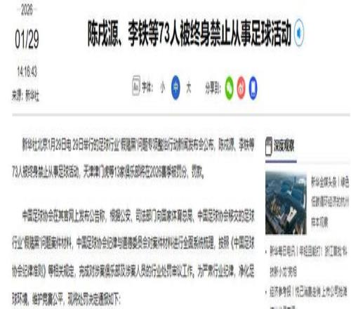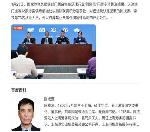 并且,發言人在會上通報,根據相關規定,對于李鐵、陳戌源等七十余人給予終身禁止從事任何與足球有關活動的處罰。