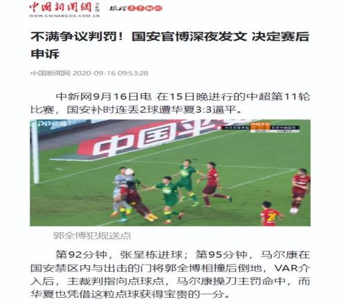 在20年中超第11輪比賽中,北京國安因不服主裁判的判罰,賽后在媒體上發文“黑暗不會永遠籠罩大地”的抗議聲明。