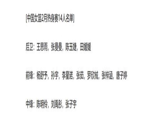 北京時間2026年2月3日消息。前天晚上,本賽季的WCBA女籃聯賽常規階段結束,接下來,聯賽球員將開始備戰“俱樂部杯比賽”。而國家隊也在這個時間段有著新的任務:2月的2場熱身賽。時間是2月7日、2月11日,在合肥、銀川同國際聯賽比賽。目前,中國隊對外公布了14人的大名單。這份人員中,絕大部分球員近期都在北京集訓,而王思雨、張子宇兩位球員,則是重新回到國家隊中。