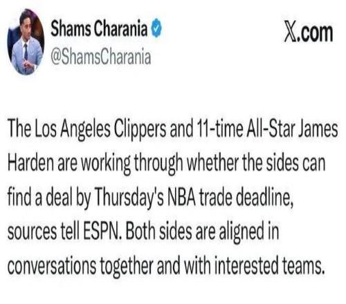 爆料王Shams:快船和哈登準備分道揚鑣,雙方正在進行溝通,并且都與感興趣的球隊進行了對話。