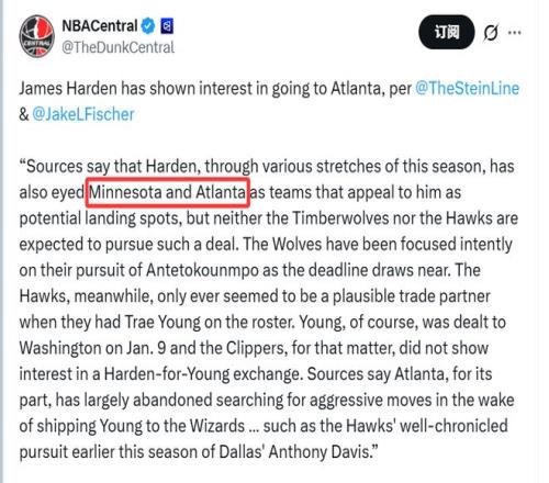 消息源透露,本賽季多個階段里,哈登都將森林狼與老鷹視為心儀的潛在下家,但森林狼與老鷹兩隊預計都不會推進相關(guān)交易。