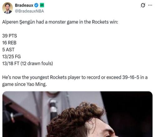 憑借這樣的表現,23歲193天的申京成為姚明后,火箭隊史單場至少拿下39分16板5助最年輕的球員。