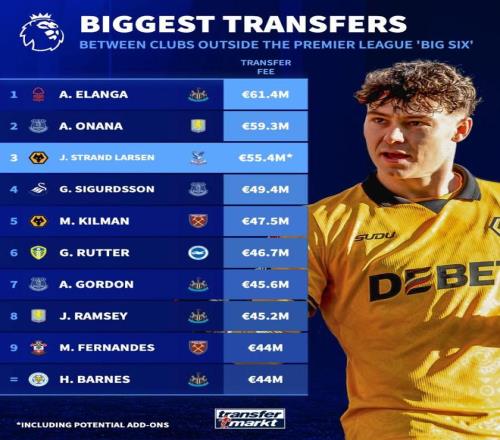 北京時間2月3日,德轉統計出了英超歷史除BIG6以外最貴的10筆交易,紐卡斯爾聯去年夏天6140萬歐元從諾丁漢森林引進埃蘭加排名第一,今年冬窗水晶宮轉會費加獎金總價5540萬歐元從狼隊引進尤爾根-拉森排名第三。