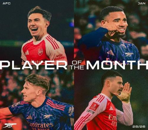 北京時間2月3日,阿森納官方公布了1月最佳球員的候選名單,其中哲凱賴什、蘇比門迪、熱蘇斯和馬丁內利在列。