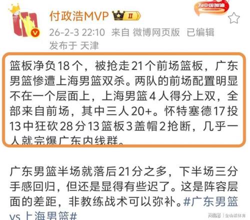 賽后,媒體人付政浩MVP社媒發(fā)文表示:籃板凈負(fù)18個(gè),被搶走21個(gè)前場籃板,廣東男籃慘遭上海男籃雙殺。兩隊(duì)的前場配置明顯不在一個(gè)層面上,上海男籃4人得分上雙,全部來自前場,其中三人20+,懷特塞德28分15籃板3蓋帽2搶斷,幾乎一人就完爆廣東內(nèi)線群……