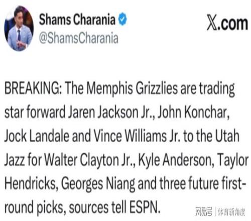 咱來看看這爆料大神Shams的消息哈:灰熊大手一揮,把3J(小賈倫 - 杰克遜)、康查爾、蘭代爾還有小文斯 - 威廉姆斯打包送去了爵士,換回來李凱爾、小克萊頓、亨德里克斯、尼昂,外加三個首輪簽。喲呵,好家伙,多達7換4呀,這妥妥是今年到目前為止最大的一筆交易誕生咯,簡直就像在交易市場投下了一顆超級大炸彈!