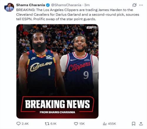 Shams表示:對于騎士隊而言他們得到了NBA歷史75大巨星,球隊的硬實力再度提升,讓他們在東區繼續具有沖冠競爭力。米切爾、哈登的后場組合實力很強,而且兩人都可以打雙能衛的全明星。