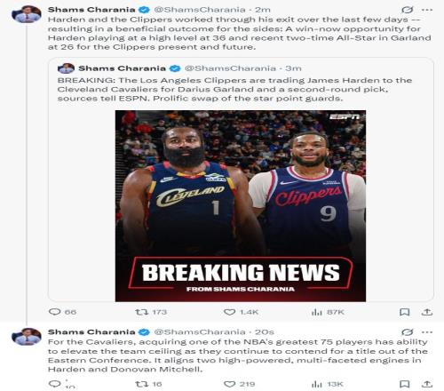 北京時間2月4日,根據ESPN記者Shams的報道,騎士隊與快船隊達成重磅交易,快船將哈登送入克利夫蘭換取加蘭、1個次輪簽。