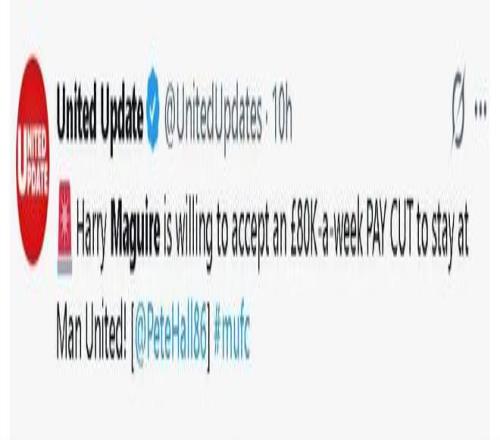 但據其報道,如果馬奎爾愿意接受大幅降薪,每周少拿約8萬英鎊,并同意俱樂部新約的其他條件,就仍有可能留在球隊。在報道中,英媒所說的是:if the England international is willing to take a substantial pay cut of about £80,000 a week,而社媒忽略了「if」的假設前提,并且將每周降薪8萬英鎊誤解為「降薪至8萬英鎊」。