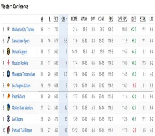 可以看到西部前四的球隊只有馬刺、火箭1個全明星,但馬刺與火箭有著明顯的區別,馬刺只有文班亞馬一個場均20+的球員,而火箭有兩個,就連西部第六的湖人都有兩個全明星。