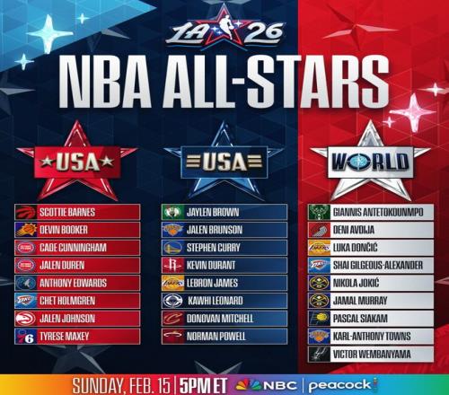 因為小卡入選全明星后,三支全明星隊伍也就此確定,美國隊是以年齡分兩隊,詹姆斯、杜蘭特、庫里、布朗、布倫森、倫納德、米切爾、鮑威爾在一支球隊。世界隊有9人,
