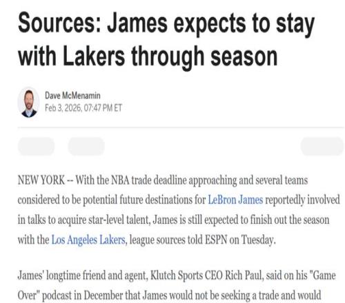 消息來(lái)自于ESPN名記Dave McMenamin,他表示數(shù)支傳言是詹姆斯下家的球隊(duì)正在進(jìn)行引進(jìn)球星的談判,但詹姆斯預(yù)計(jì)將在湖人打完本賽季剩余比賽。
