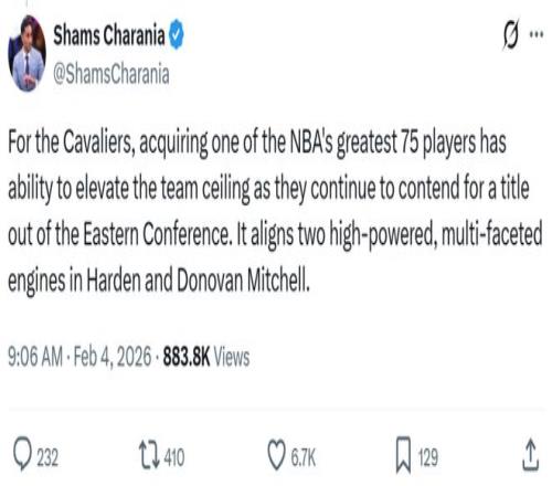 正如名記Shams所說:“對于騎士隊來說,引進哈登這樣一名75大巨星顯然能夠提高球隊上限,他與米切爾的聯手將讓球隊有資格在東部競爭冠軍。”