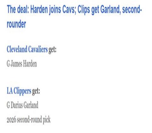 在傳出哈登向快船提出交易申請后不到24小時,快船與騎士便迅速圍繞哈登與加蘭完成2換1交易,具體內容為:
