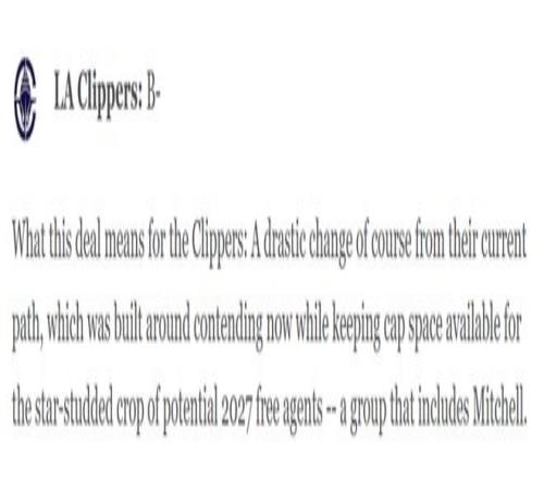唯一的風險是加蘭的傷病問題與矮小的身材,這也是他們僅拿到B-的原因,但快船在如此艱難的困境中找到一條看起來是兩全的策略已經實屬不易。