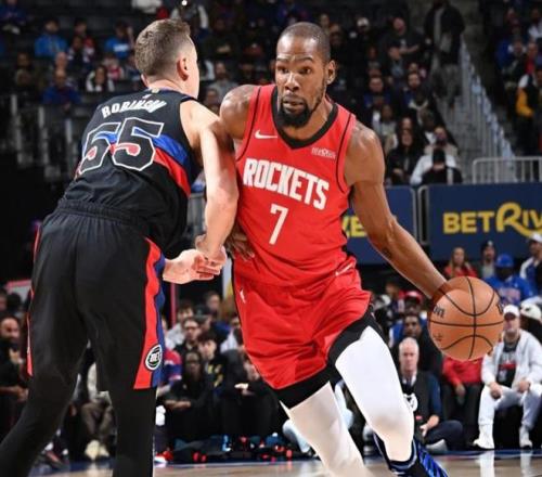 火箭去年休賽期從太陽換來杜蘭特后,目前以29勝17負的戰績穩居西部第四的位置。這份成績單相當不錯了。因為這是在核心球員范喬丹和亞當斯賽季報銷的情況下。杜蘭特幾乎以單核帶隊的姿態,扛起了球隊的進攻大旗,他的表現無可挑剔,在攻防兩端都是這樣。截至目前,37歲杜蘭特在本賽季為火箭出戰44場,全部首發,場均上場36.8分鐘,貢獻26.5分5.4籃板4.5助攻,投籃命中率高達51.4%,三分命中率達到40.8%,罰球命中率88.6%。