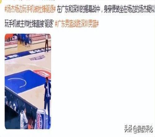 外界重點關注湯杰玩手機,大概率是廣東對陣深圳的比賽,杜鋒要求年輕球員需要認真看比賽,但湯杰在替補席后面玩手機,怒氣值拉滿杜鋒直接驅逐了湯杰離場。