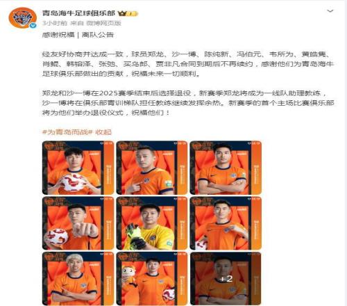 2月4日,青島海牛俱樂部官宣,鄭龍、沙一博、陳純新、馮伯元、韋所為、黃皓雋、肖鯤、韓镕澤、張弛、買烏郎、賈非凡合同到期不再續約,海牛俱樂部祝他們未來一切順利。鄭龍、沙一博選擇退役,其中,鄭龍將成為海牛一線隊助理教練,沙一博將在俱樂部青訓梯隊擔任教練發。