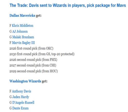 獨行俠得到:米德爾頓、AJ-約翰遜、布蘭納姆、巴格利、2026年首輪簽(來自雷霆)、2030年受保護首輪簽(來自勇士,前20保護)、2026年次輪簽(來自太陽)、2027年(來自公牛)和2029年次輪簽(來自火箭)。