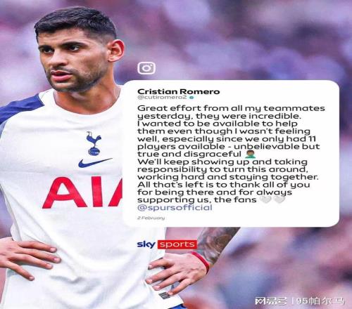 近期逼平曼城并不足以制造以下犯上的喜悅感,事實上熱刺主帥弗蘭克已經自我批評過:“我們的進攻不夠流暢”。然而真正的“炮火”來自內部,羅梅羅在社交平臺上就發泄了情緒:“我們全隊只有11個人能踢球,這聽起來匪夷所思,然而這是事實,也是恥辱。”