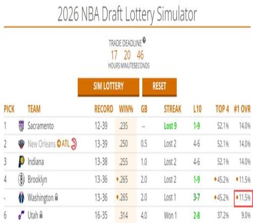 目前奇才13勝36負,狀元簽概率11.5%,前四順位概率45.2%,實際上奇才與國王、鵜鶘、步行者勝場只差2-1.5個,奇才隊說不定有希望繼續擺爛到最差,奇才隊可以沖擊一下狀元簽。