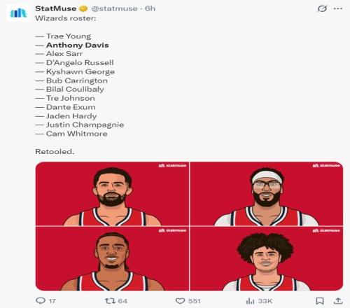 這筆交易后,根據ESPN的消息,本賽季被奇才交易得到的全明星球員特雷楊、安東尼-戴維斯都不會再這個賽季代表奇才隊出戰,球隊內部志在輸掉更多比賽沖擊更高的順位,AD與特雷楊也可以利用今年來將傷病全部治愈。
