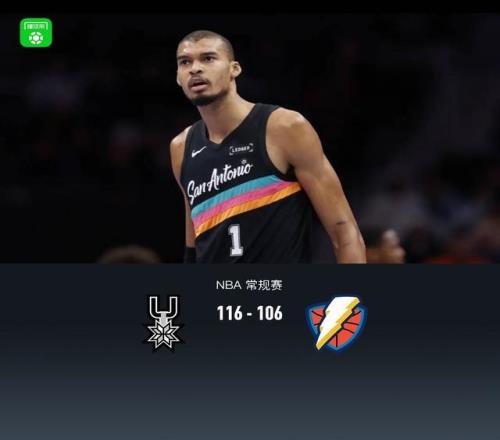 第四節,前半節雙方保持混戰拉鋸,雷霆依靠三分得分,馬刺持續沖框回應,節中段雷霆持續沖框不中,馬刺連續失誤,后半節上來馬刺連續三分嘗試不中,雷霆抓住機會追至4分,馬刺卡斯爾、文班亞馬聯手得分穩住局面再度拉大至兩位數,全場結束,馬刺116-106戰勝雷霆。