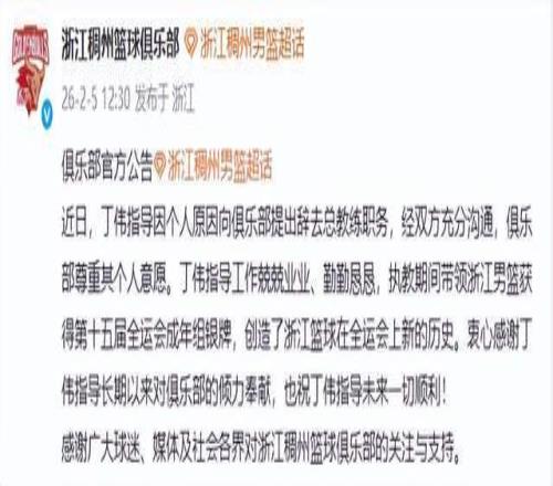 2月5日,浙江男籃官宣丁偉辭去總教練職務。這一次,CBA圈內沒人感到意外——這已是他在浙江的第三次“下課”。