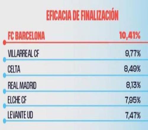 根據西甲官方列出的統計數據,巴薩是本賽季西甲射門轉化率最高的球隊,也是控球涉及人數、創造威脅次數最多,成功阻止對手射門比例最高的球隊。