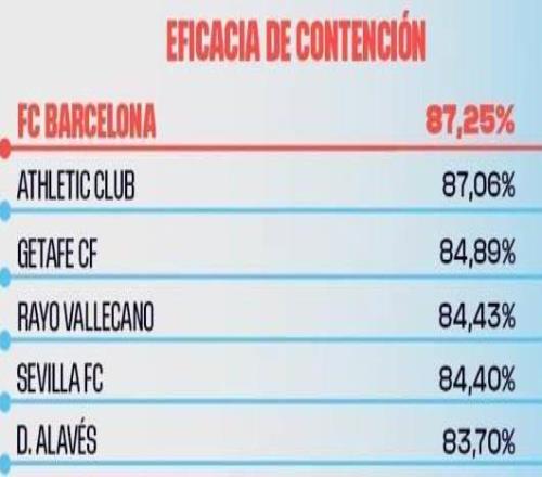 此外,巴薩是每次控球涉及球員最多的球隊(3.74人),并且每場比賽中創造威脅的控球次數最多(6.5次)。另一方面,盡管巴薩的防線是整個聯賽中最靠前的,但他們也是西甲聯賽中防守效率最高的球隊。