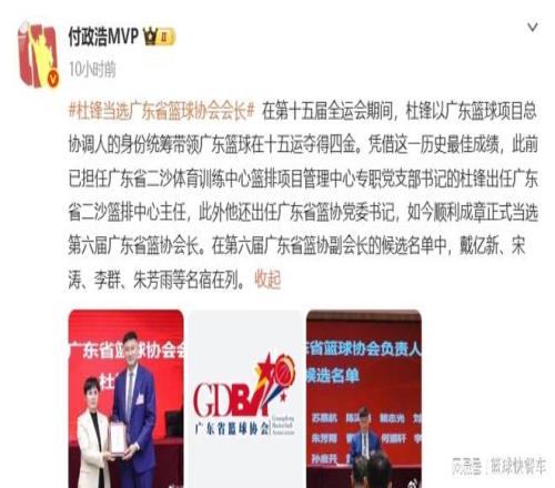 而憑借著去年全運會幫助廣東隊奪冠,杜鋒也成為了最大的功臣。在他負責的籃球項目中,廣東隊四奪金牌,憑借著這一歷史最佳戰績,杜鋒成功當選第6屆廣東省籃球協會會長。至此,作為廣東隊歷史上最成功的球員之一,杜鋒又有了一個全新的身份。在杜鋒當選廣東省籃協會長后,不少廣東球迷也開始給杜鋒送祝福了。不過,也有廣東球迷建議,杜鋒應該盡快想辦法,把深圳隊的賀希寧和王浩然“忽悠”到廣東隊。