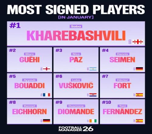 馬克-格伊、尼科-帕斯、迪奧曼德、阿尤布-布阿迪……看到這些名字還算正常。然而,在熱門游戲《足球經(jīng)理》1月份全球最常被簽下的十名球員中,有一個排名第一的名字格外引人注目,因為幾乎無人知曉他是誰——:薩巴-哈列巴什維利(第比利斯,2008年9月3日出生)。