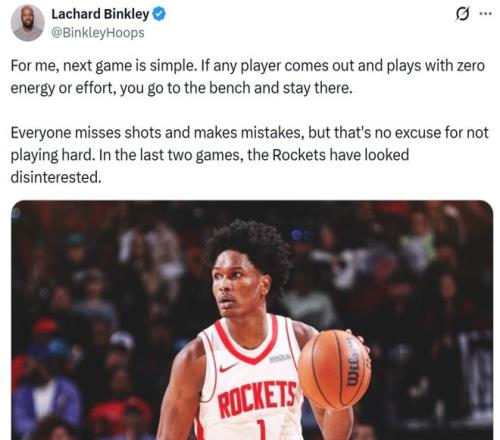 賽后火箭隨隊記者Lachard Binkley也不禁吐槽道:“投籃失準和失誤都可以接受,但絕沒有不努力的理由,下一場的要求就是有球員上場后毫無能量、毫無拼勁,那就直接坐冷板凳。”