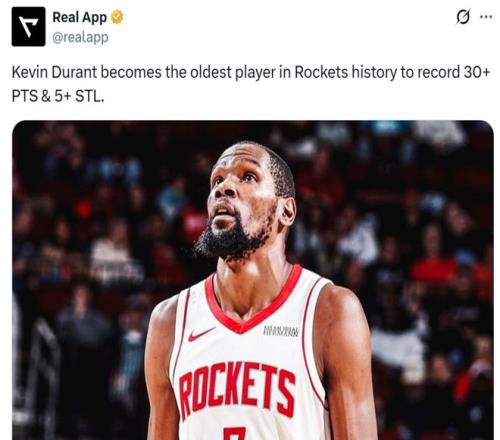 全場杜蘭特21中11,三分4中3,面對堪稱災難級別進攻環境,還是拿下31分3板1助5搶斷,這讓37歲130天的杜蘭特成為火箭隊史單場拿下至少30分5搶斷最老的球員,無奈他依舊無法扭轉局面。