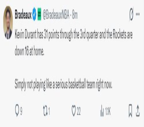 第三節的杜蘭特已經竭盡全力,火箭的整體防守表現不佳,拼搶籃板球的積極性也不佳,杜蘭特單節9中6爆砍15分1籃板1搶斷分差還進一步被拉開,三節打完杜蘭特31分鐘拿到31分5搶斷,這樣的攻防表現都無法幫助球隊縮小分差。