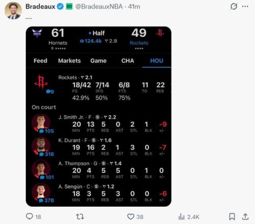 次節杜蘭特的個人進攻也受到限制單節4中2拿到5分1助攻2搶斷,半場拿到16分,小賈半場13分,球隊核心申京半場18分鐘只拿到3分,阿門半場也只拿到4分,雙核狀態低迷的情況下半場火箭也落后到兩位數。
