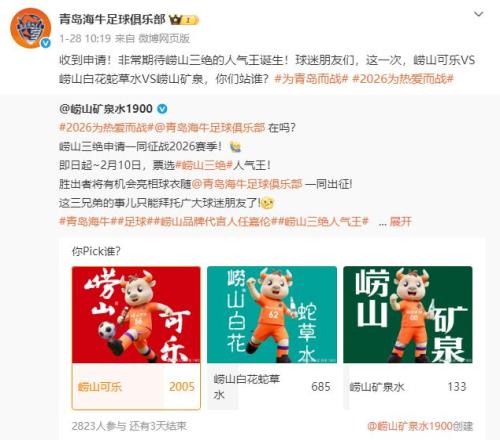 值得一提的是,青島海牛的胸前廣告已經(jīng)呼之欲出,并確定為“嶗山三絕”(嶗山可樂、嶗山白花蛇草水、嶗山礦泉)中的一款,目前這三款產(chǎn)品正在火熱打榜中,相信很快會有結(jié)果。