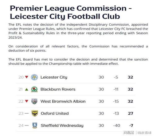 英格蘭足球聯(lián)賽(EFL)剛剛發(fā)布消息,表示注意到獨立紀(jì)律委員會的決定,這是根據(jù)英超聯(lián)賽規(guī)則而任命的,確認(rèn)了萊斯特城因為在過去三個賽季里,違反了盈利和可持續(xù)(PSR)的規(guī)則。因此,立刻扣除萊斯特城6個積分,并且從實時的積分榜中反映出來。