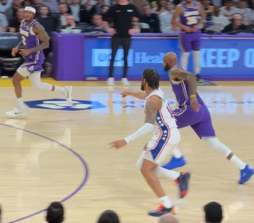 末節開場里夫斯連續兩個三分球,但詹姆斯差點三不沾,詹姆斯面對恩比德的防守竟然被斷了,一個比他高10厘米的中鋒掏球他都護不住!詹姆斯助攻斯瑪特一個,詹姆斯制造馬克西第五次犯規,隨后勒布朗還完成了一個君臨天下的暴扣。