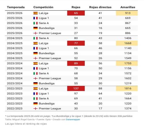 據(jù)《馬卡報》報道,西甲本賽季紅牌數(shù)已累計達(dá)65張,高居五大聯(lián)賽之首。若趨勢延續(xù),全年紅牌總數(shù)預(yù)計將突破110張。