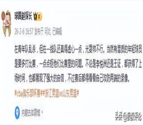 媒體人趙探長發文點評:在青年隊亂殺,但在一線隊還真得虛心一點,光耍帥不行。當然有潛質的年輕球員是要多打比賽,一點點摳他們比賽里的問題。