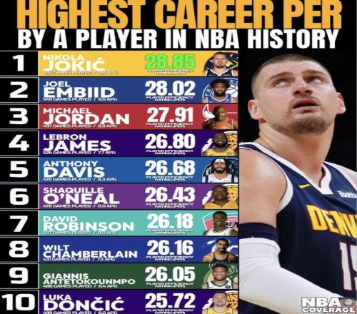 最近nba world wide coverage發布了“NBA歷史球員生涯最高球員效率值”榜單,約基奇排在第1,恩比德、喬丹緊隨其后,詹姆斯也進了前四。榜單里既有奧尼爾、張伯倫這種長期被反復對比的歷史中鋒,也有字母哥、東契奇這種還在上升期的現役球星。把不同時代、不同位置、不同比賽節奏下的球員放在同一張表里,光看一個“球員效率值”就把名次定死,約基奇壓過喬丹和詹姆斯排第1,這個位置到底算不算合理?