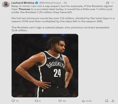 隊記Binkley對此分析道,由于火箭目前僅低于第一硬帽125萬美元,倘若真的要簽下托馬斯,那么后者的薪資最高不超過125萬美元,而競爭者們能夠給出更高的價錢。