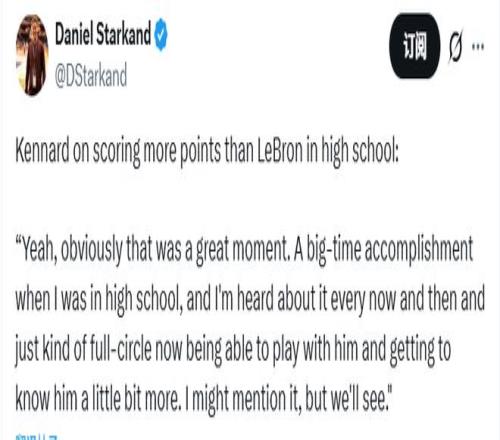 有美媒報道,肯納德高中生涯得到2977分,甚至高于詹姆斯的高中生涯(2657分)。談及高中時期得分比詹姆斯多,肯納德表示:“當然,那是段超棒的回憶,也是我高中時的一大成就。直到現在偶爾還會有人提起這事,如今能和他并肩作戰、慢慢更了解他,感覺一切都很圓滿。我或許會跟他提提這事,不過看情況吧。”