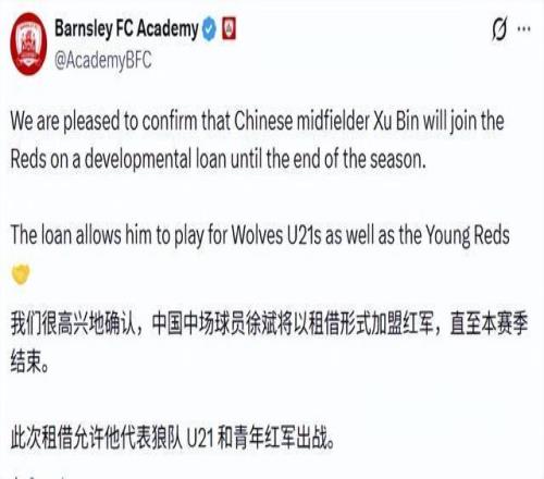 相比于狼隊(duì)的官宣,巴恩斯利這邊發(fā)布徐彬租借加盟消息的,卻是巴恩斯利足球俱樂部學(xué)院。