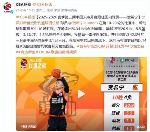 北京時間2月6日,CBA官方公布2025-26賽季第二期月度獎項,深圳男籃一戰封神——山東濟南小伙賀希寧當選月度最佳國內球員,史密斯榮膺月度最佳國際球員。這不是偶然,而是一場關于效率、統治力與團隊崛起的完美合奏。