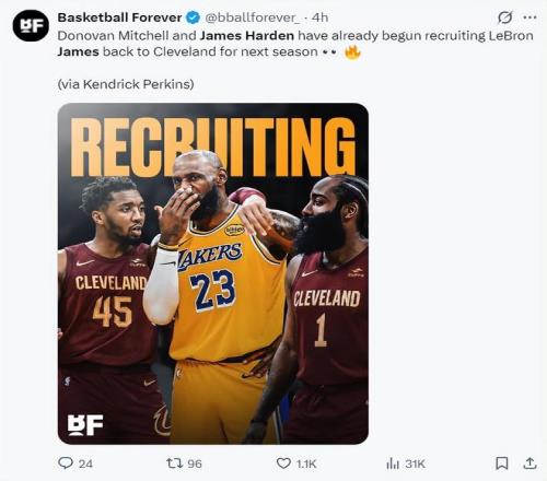 帕金斯還透露一個細節,在今夏休賽期,米切爾與哈登兩人都會來說服詹姆斯簽約克利夫蘭,大家一起沖擊總冠軍。