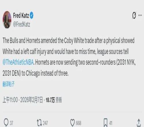 北京時間2月7日上午11點,據NBA記者Fred Katz報道,科比-懷特的體檢出了問題,黃蜂隊發現懷特的左小腿受傷,需要缺席一段時間。這筆交易已經在兩天之前官宣完成,今天黃蜂和公牛緊急修改了交易方案,黃蜂撤回1個次輪簽。