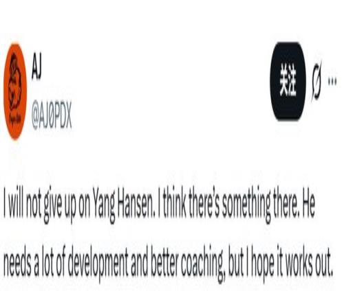 球迷AJ發文寫道:“我絕不會放棄對楊瀚森的期待。我相信他身上是有潛力的。他確實需要大量的打磨提升,也需要更優質的指導,但我真心希望他能越來越好。”